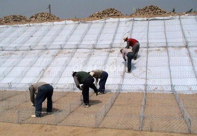 4.安及材料:安装好后,将双隔板雷诺护垫放在指定位置,再将各个网垫连接起来。为了保持整体架构便于连接,可以空箱连接后在装石料。连接时我们提供绑丝或者环形紧固丝。护坡时需用与坡体垂直宽的雷诺护垫。除了用于河渠缓坡外,双隔板雷诺护垫还可以用于陡坡中。用于陡坡防护时,要在上层底板上每2m或按工程需求楔入硬木楔。