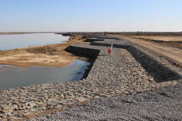 宾石笼护脚作为水利防护网中的一种,其结构是以蜂巢形堤防格宾石笼网片由人工组装成的箱笼。并装入块石等填充料,用作护底或护脚的新技术。因为格宾石笼护脚是由蜂窝状网状物组成的防护体,具有一定的抗拉强度,不容易拉断,填料之间存在一定的间隙,具有一定的适应性和变形能力。当施工现场地基发生变化时,如发生不均匀的沉降等,填充满石料的石笼受制于箱体石块不会向外跑出,而且会自然地随之调整新的平衡由于格宾石笼护脚的柔性结构,使堤坝格宾石笼护脚防护工程表面可能将产生小的变异,但不会产生裂隙,格宾石笼网箱的拉断不会造成格宾石笼防护体被破坏的现象。