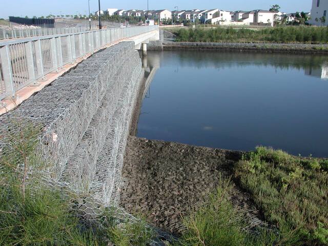 铁笼原材料具有一定的强度,不易被拉断,整体强度较高格宾石笼护脚可承受适度的变形,这样,整个工程便可连成一个整体,且不需要分缝,即使由于某些原因造成一条网丝断裂,也不会影响整个结构的完整性.特别是在地基土体沉陷或墙后土体变形较小时,格宾石笼护脚结构可进行自适应微调,不会出现因不均匀沉陷造成的沉陷缝等,整个结构不会受到破坏。